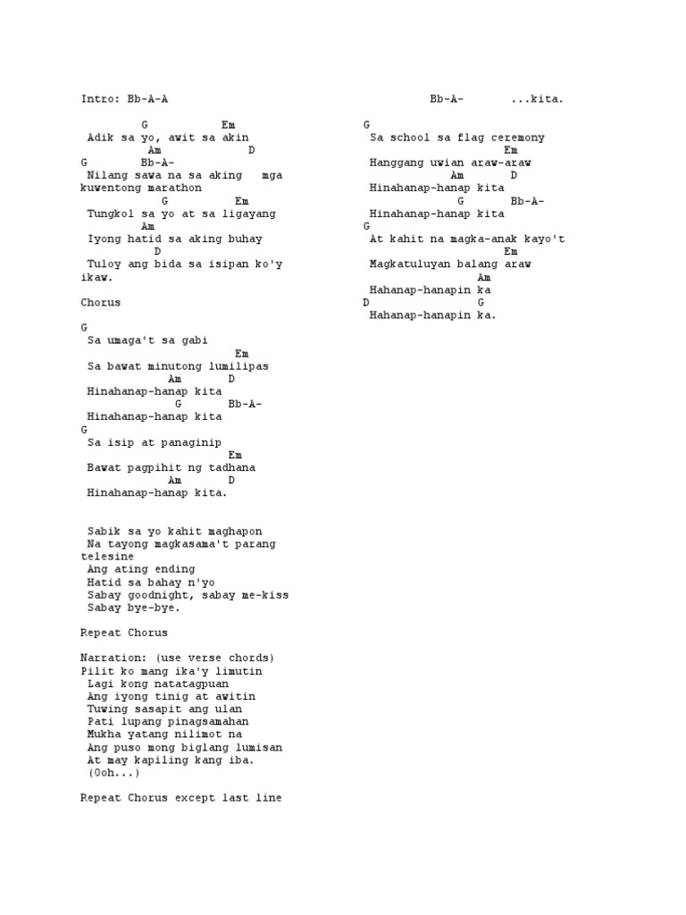 Dmaj7 Sa himb E ing ng pag-i Fm dlip akoy ginis A ing ng paglisan mo Dmaj7 Baba E lik ka bang mu Fm li kahit A na sa panaginip na lang. Fm A Dmaj7 E G Dmaj7 Babalik E ka bang m Fm uli. Hindi niya mapapantayan Bakit di mo pigilan Ang puso mong tunay na nahirapan dahil sa kanya.