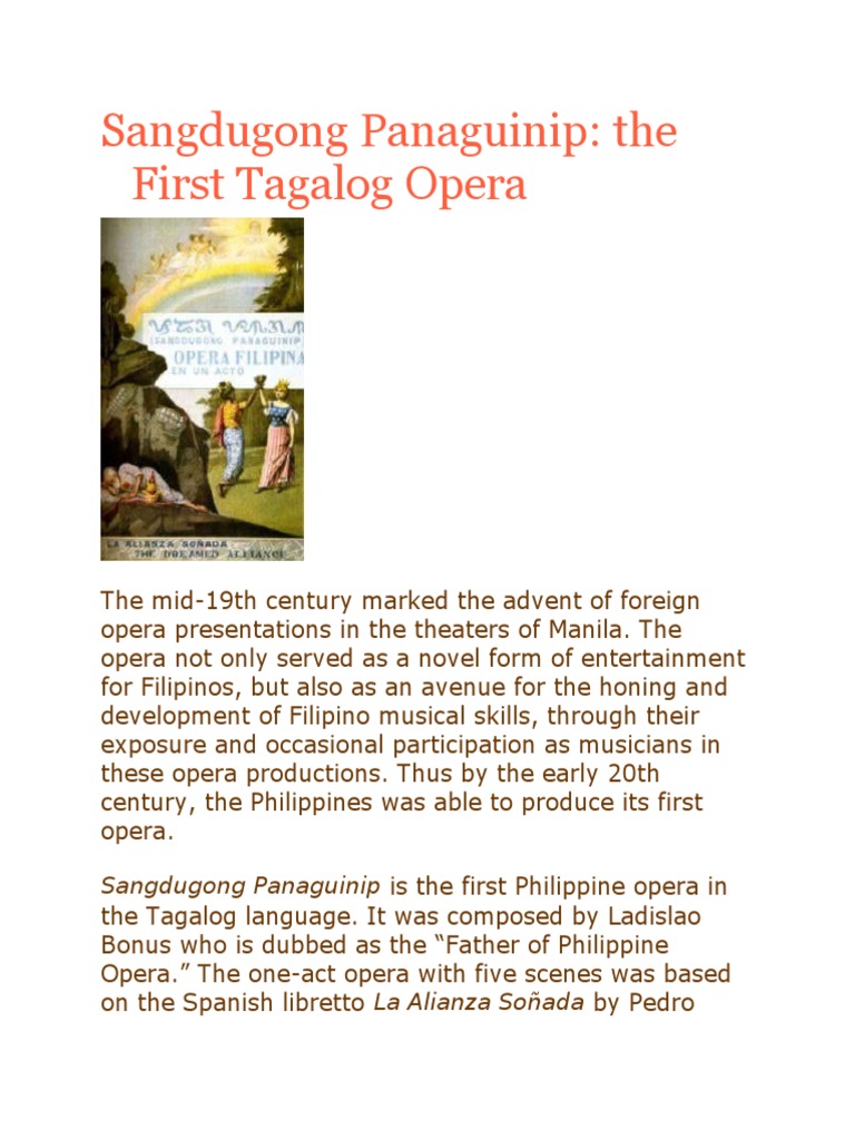 The opera was composed by Ladislao Bonus in the Tagalog language the first in Philippine opera history and was based on a translation made by Roman G. Sangdugong Panaguinip is the first Philippine opera in the Tagalog language.